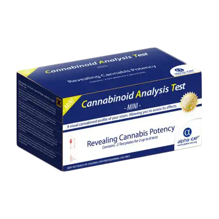 Alpha-cat is a Cannabinoid Analysis Tool which combines the simple analytical technique of thin-layer chromatography (TLC) with specific thin-layers and developing fluid. Thanks to this new protocol the main active ingredients of the cannabis plant parts can be visualised due to a highly specific colouring reaction which represent the cannabinoids present in the sample of cannabis or cannabis product. Alpha-cat‘s method enables the detection and identification of six (6) of the main cannabinoids present in cannabis: